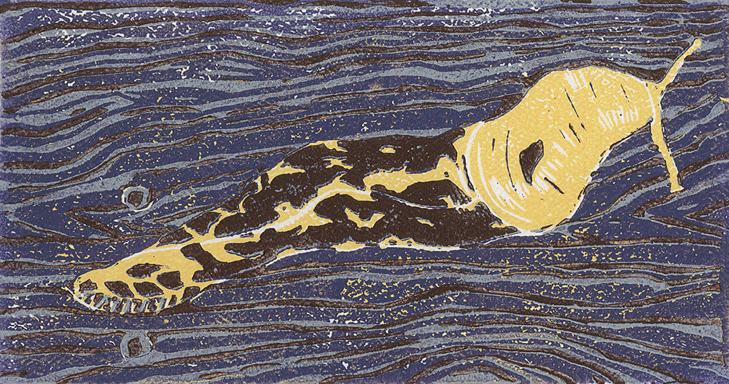 This is one of the first block prints I did of the west coast. Banana slugs illustrate the ripening of our much loved tropical fruit from all yellow to speckles of brown. They are big, eat gardens, feel gross if you squish one in your bare feet. I have found them in my car, in my gumboots, hiding in my kayak, and snacking on a yam inside my cabin. They are troublemakers in the vegetable garden but necessary to eat the incredible amount of organic matter on the forest floor. A constant source of amusement.