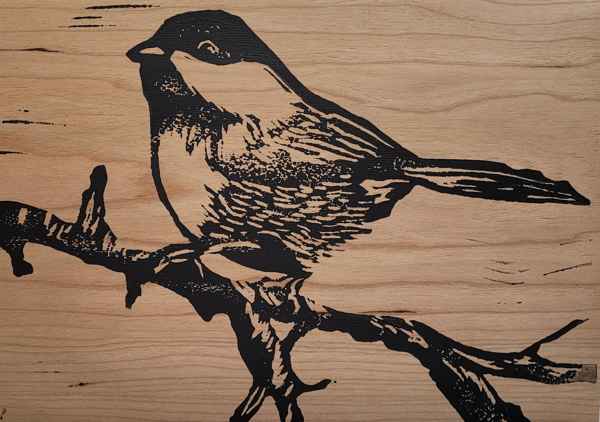 Handpressed linocut printed with black ink on real Canadian wood veneer. Mounted on an 8 x 10 inch white backer making it easy to display in a standard size matte or frame.