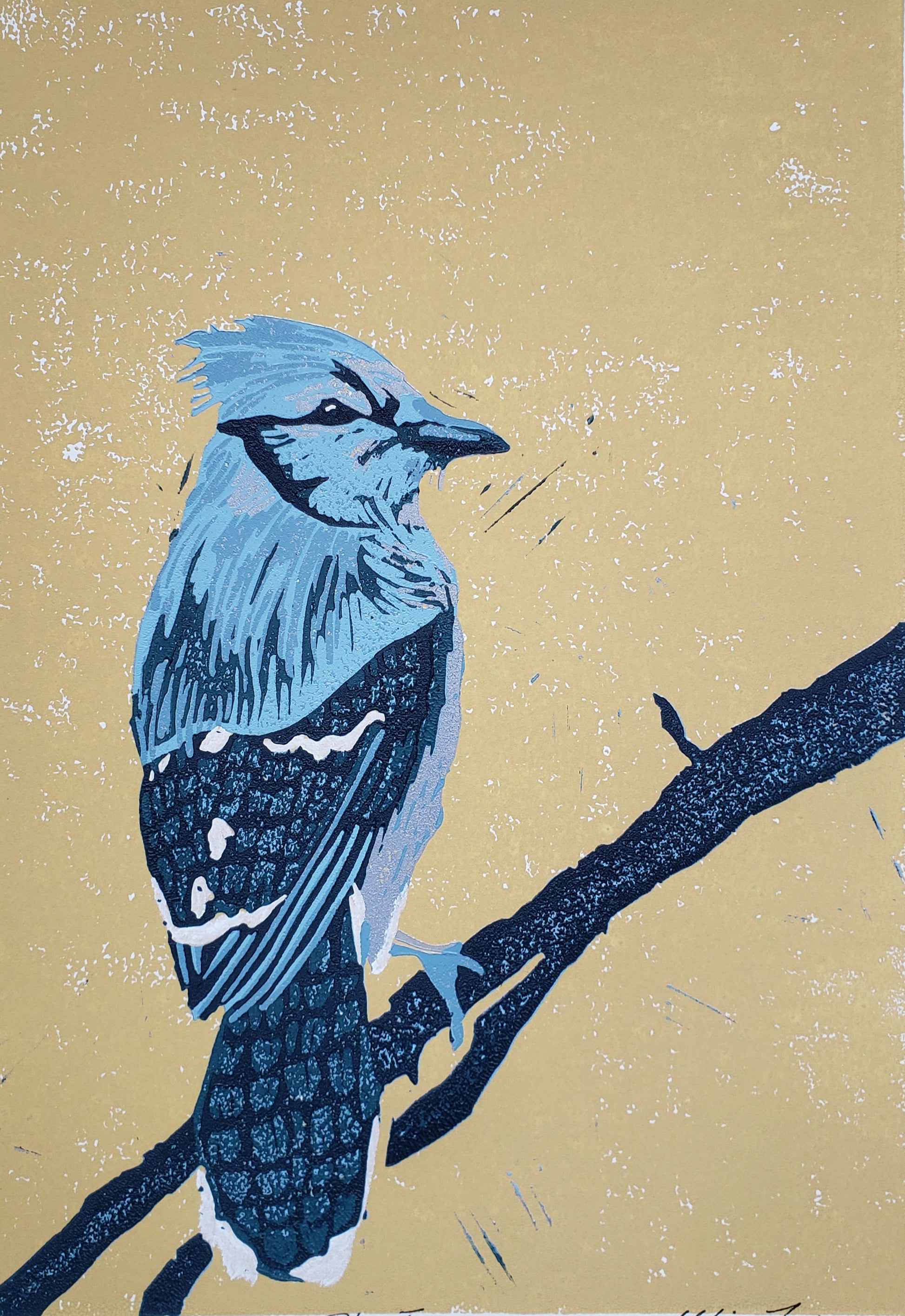 I grew up with these vocal characters outside my window in Ontario. I have not seen the gorgeous Blue Jay in years. The soft mustard yellow background is a visual example of the deepening of fall and golden hour. It really sets off the incredible blues of this talkative bird.
