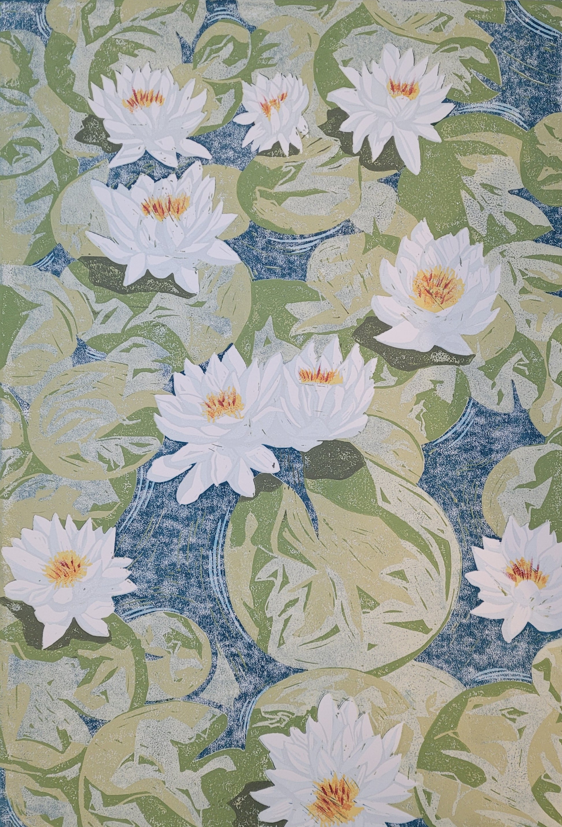 I have contemplated doing a waterlily pond for many years but it wasn't until my move to Nova Scotia it finally made sense. I discovered so many areas with the glossy leaves and crisp white flowers with a fiery center. I finally took the best photograph to work from and I feel that I captured the calm, soft, tranquility feeling of this landscape.
