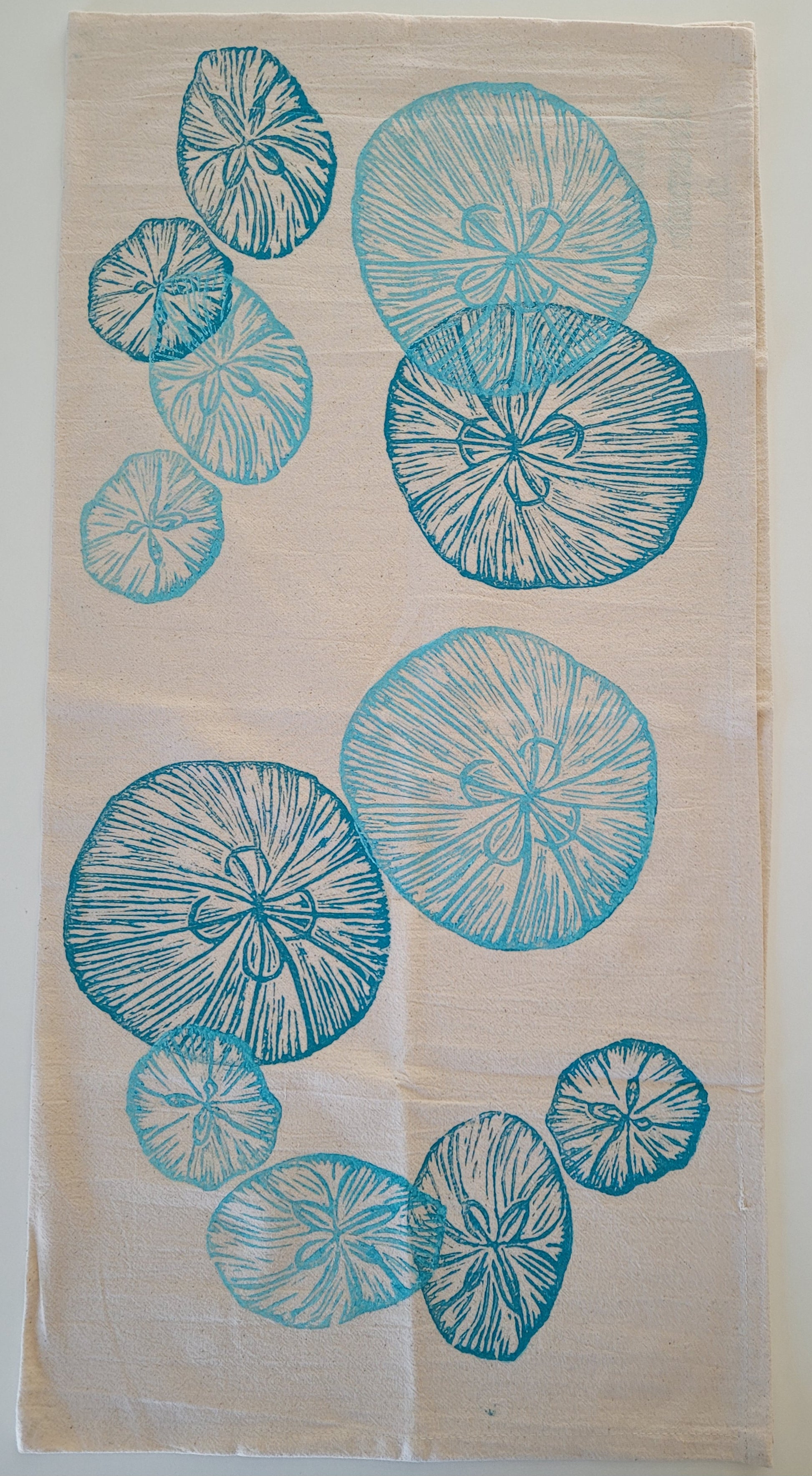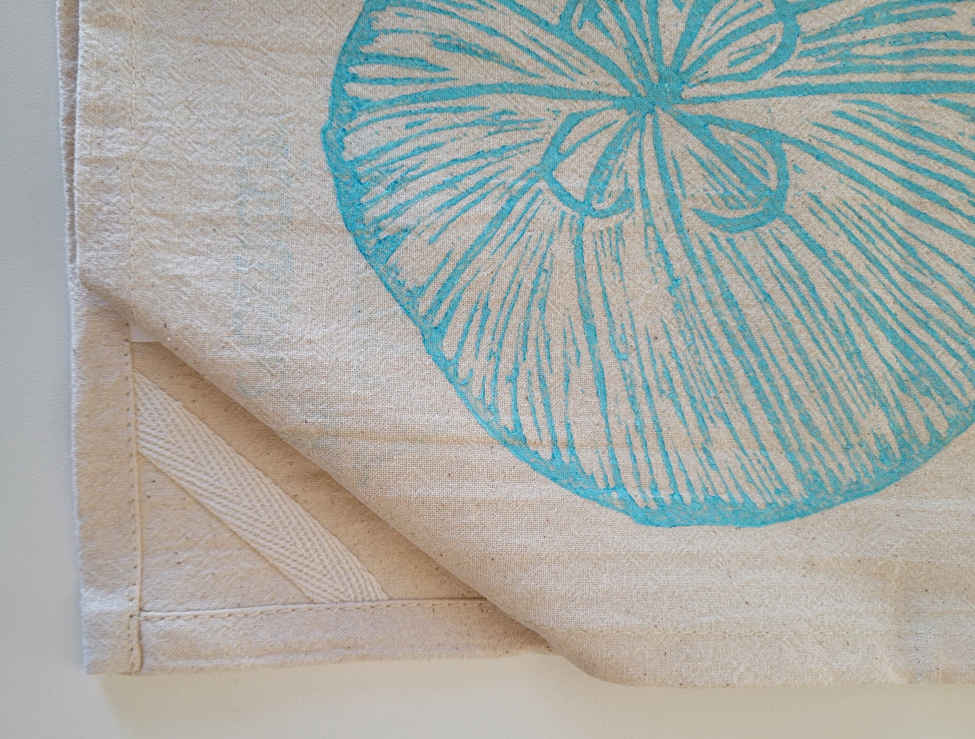 A floating crew of moon jellyfish handprinted in two ocean blues on natural organic cotton 27 x 27 inches (70x70 cm). This is a vintage style flour sack tea towel which is thin yet highly absorbent, quick drying, and lint free. Sewn in hook and printing shown on lower half of towel when folded in images. For a pop of colour in the kitchen or bathroom for everyday use. Hand sewn with mitered corners, machine washable, tumble dry low. Ink will soften after a wash. Small batch printing may cause slight changes in design.