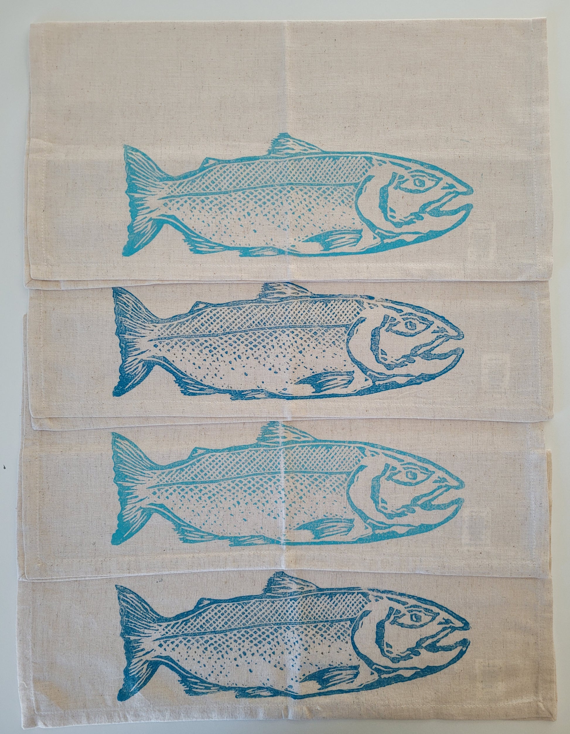 One fish? Two fish? Nope, it's four fish handprinted in two ocean blues on natural organic cotton/linen 20 x 20 inches (50x50 cm). For a pop of colour for a seafood dinner or everyday use. Hand sewn with mitered corners, machine washable, tumble dry low. Ink will soften after a wash. Small batch printing may cause slight changes in design.