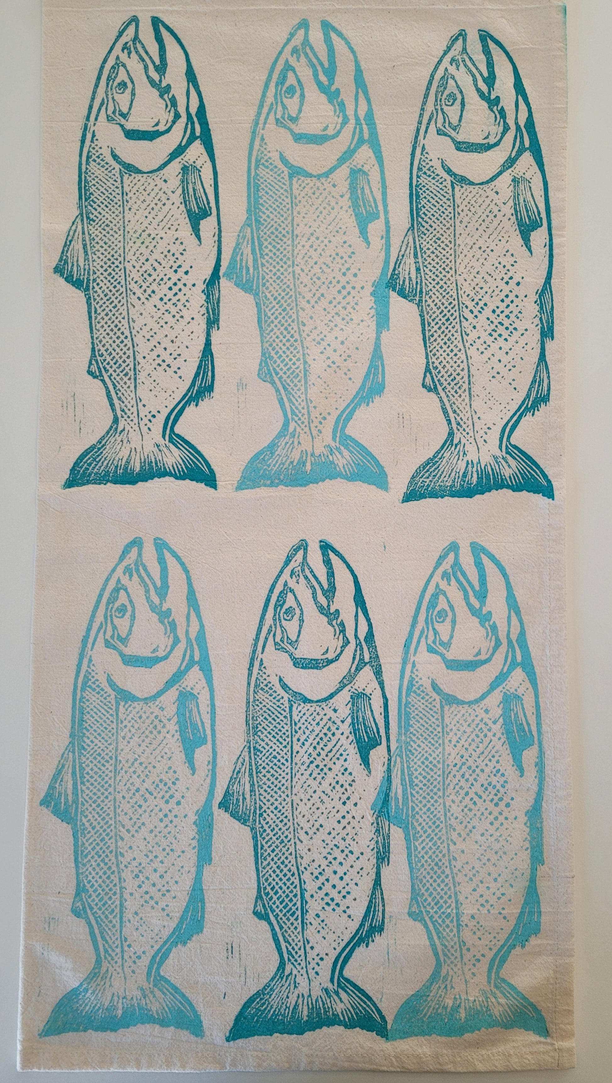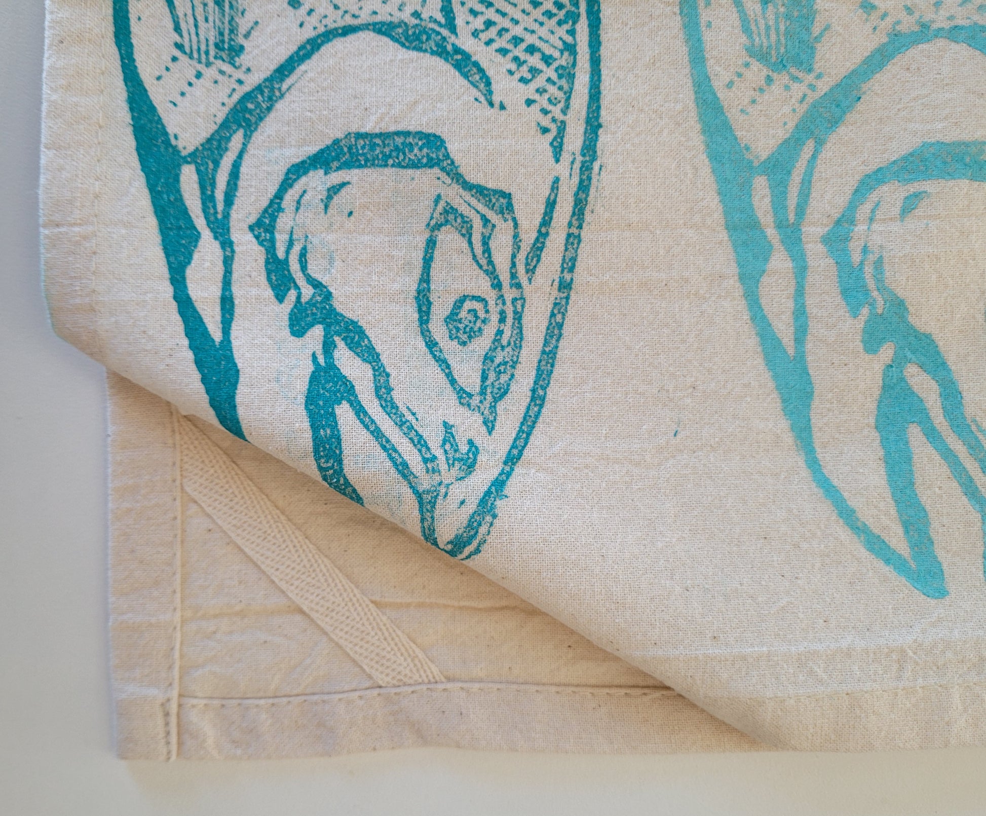 A school of fish swimming and handprinted in two ocean blues on natural organic cotton 27 x 27 inches (70x70 cm). This is a vintage style flour sack tea towel which is thin yet highly absorbent, quick drying, and lint free. Sewn in hook and printing shown on lower half of towel when folded in images. For a pop of colour in the kitchen or bathroom for everyday use. Hand sewn with mitered corners, machine washable, tumble dry low. Ink will soften after a wash. Small batch printing may cause slight changes in design.