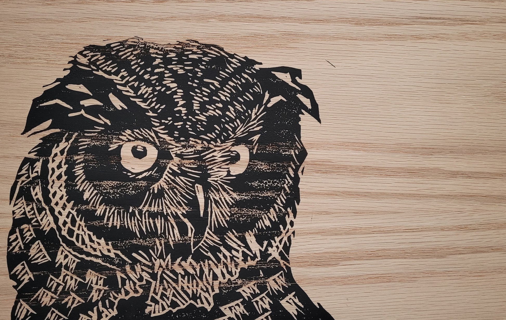 Handpressed linocut printed with black ink on real Canadian wood veneer. Mounted on an 11 x 14 inch white backer making it easy to display in a standard size matte or frame.