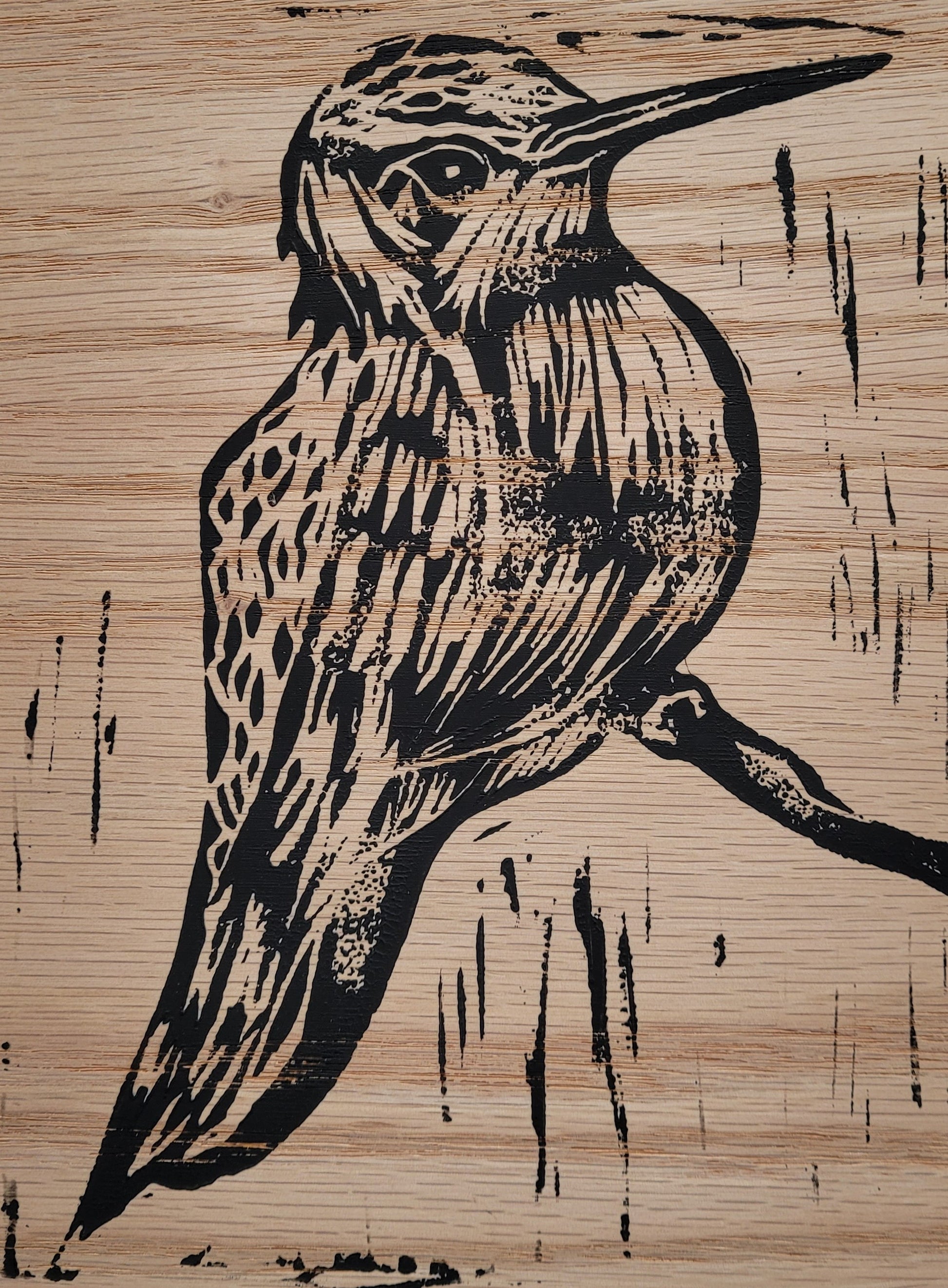 Handpressed linocut printed with black ink on real Canadian wood veneer. Mounted on an 8 x 10 inch white backer making it easy to display in a standard size matte or frame.