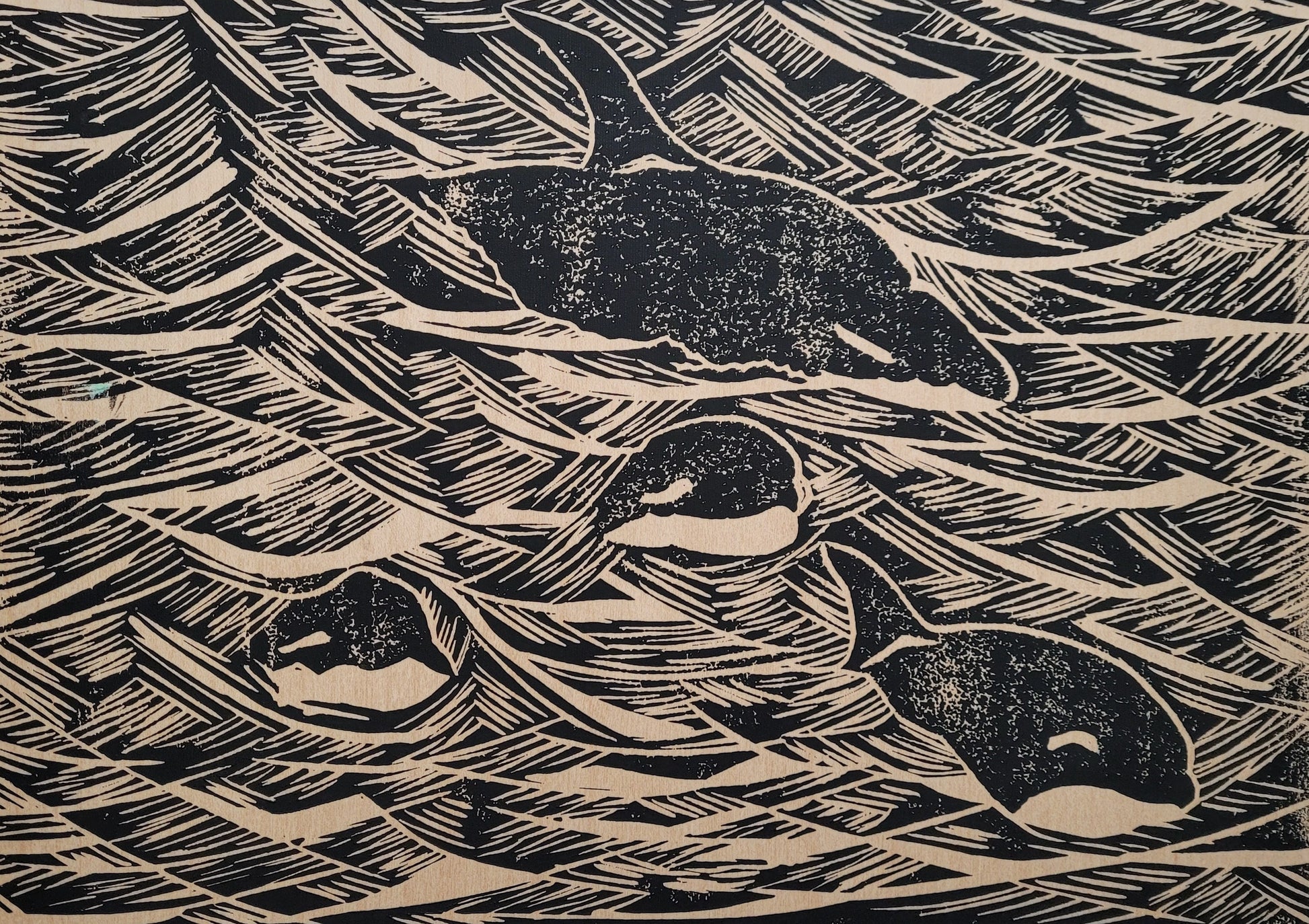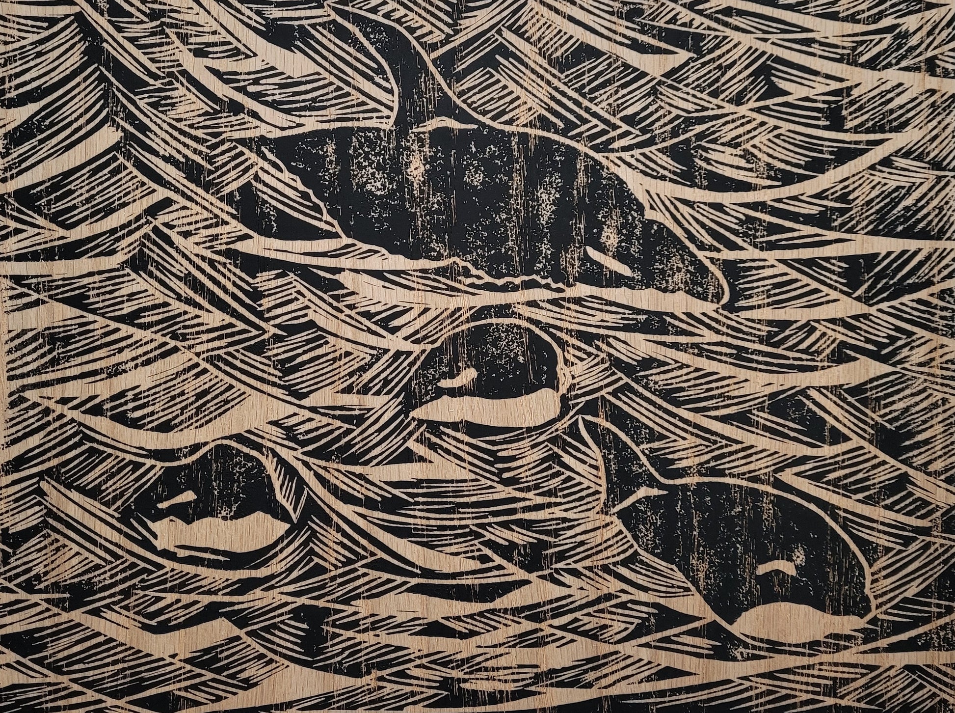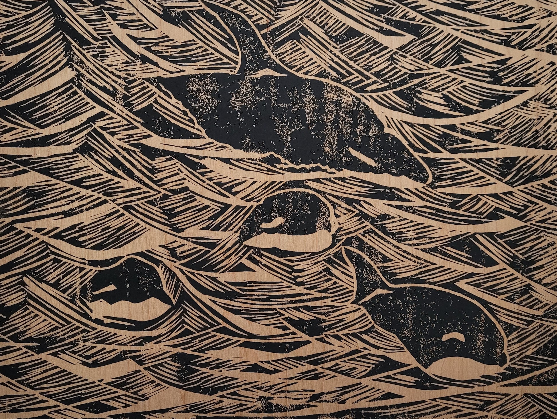 Handpressed linocut printed with black ink on real Canadian wood veneer. Mounted on an 11 x 14 inch white backer making it easy to display in a standard size matte or frame.