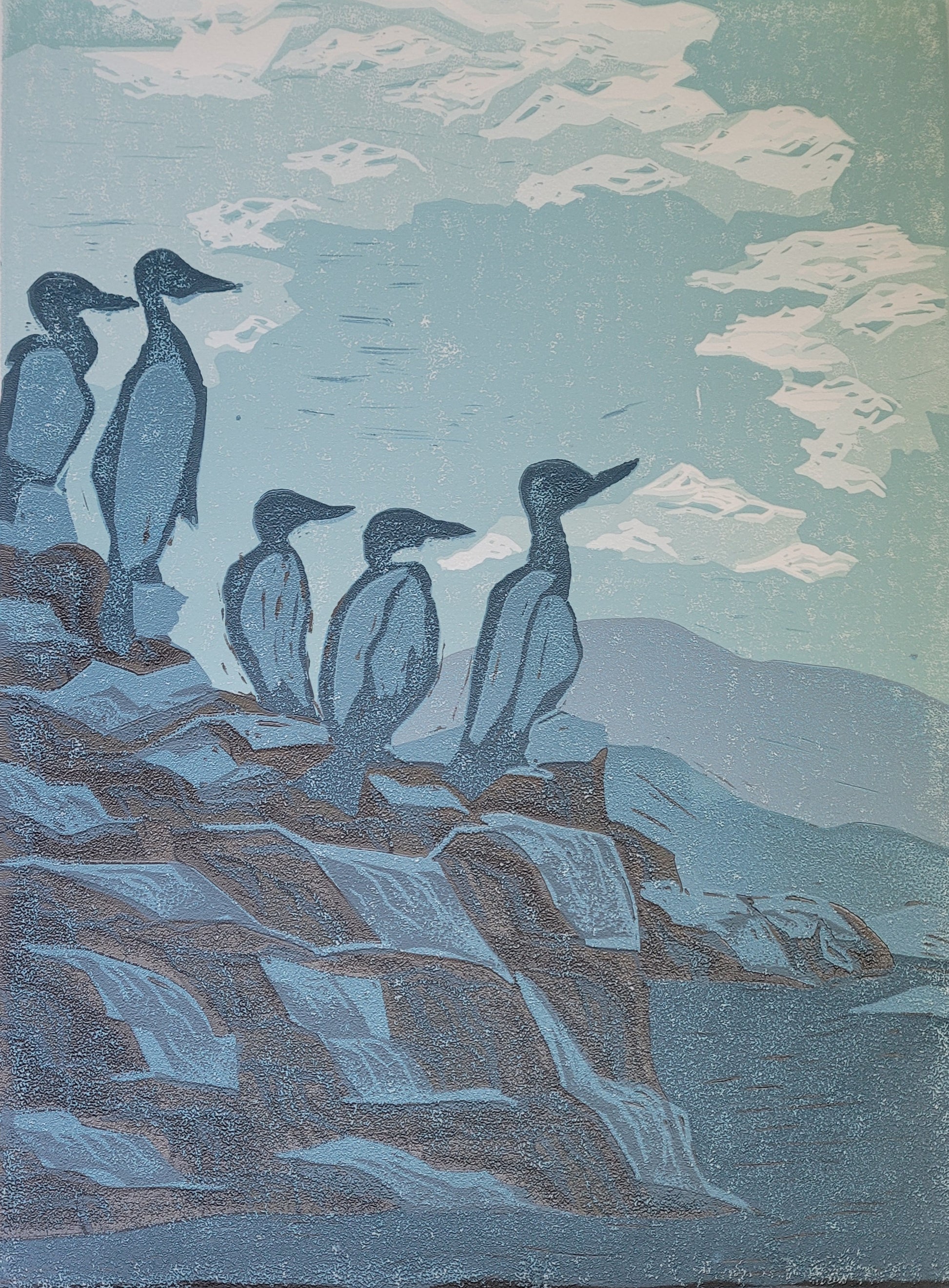 Pelagic Cormorants only land on the rocky shore to rear their young. The rest of the year they are out on the open sea. This image is inspired by MItlenatch Island off the coast of Vancouver Island. I love the colour blue, and this piece has a balance and depth of many hues of tranquil blue.