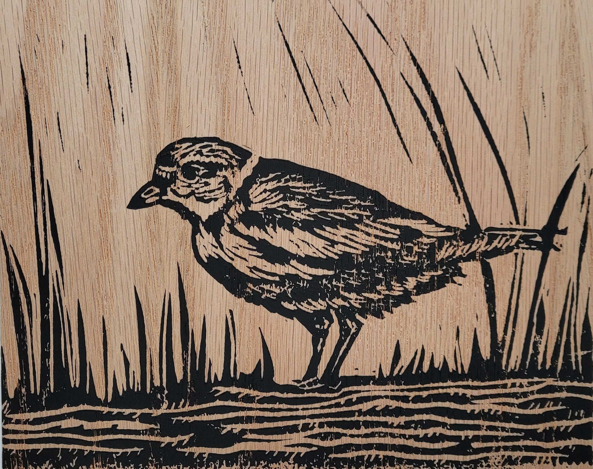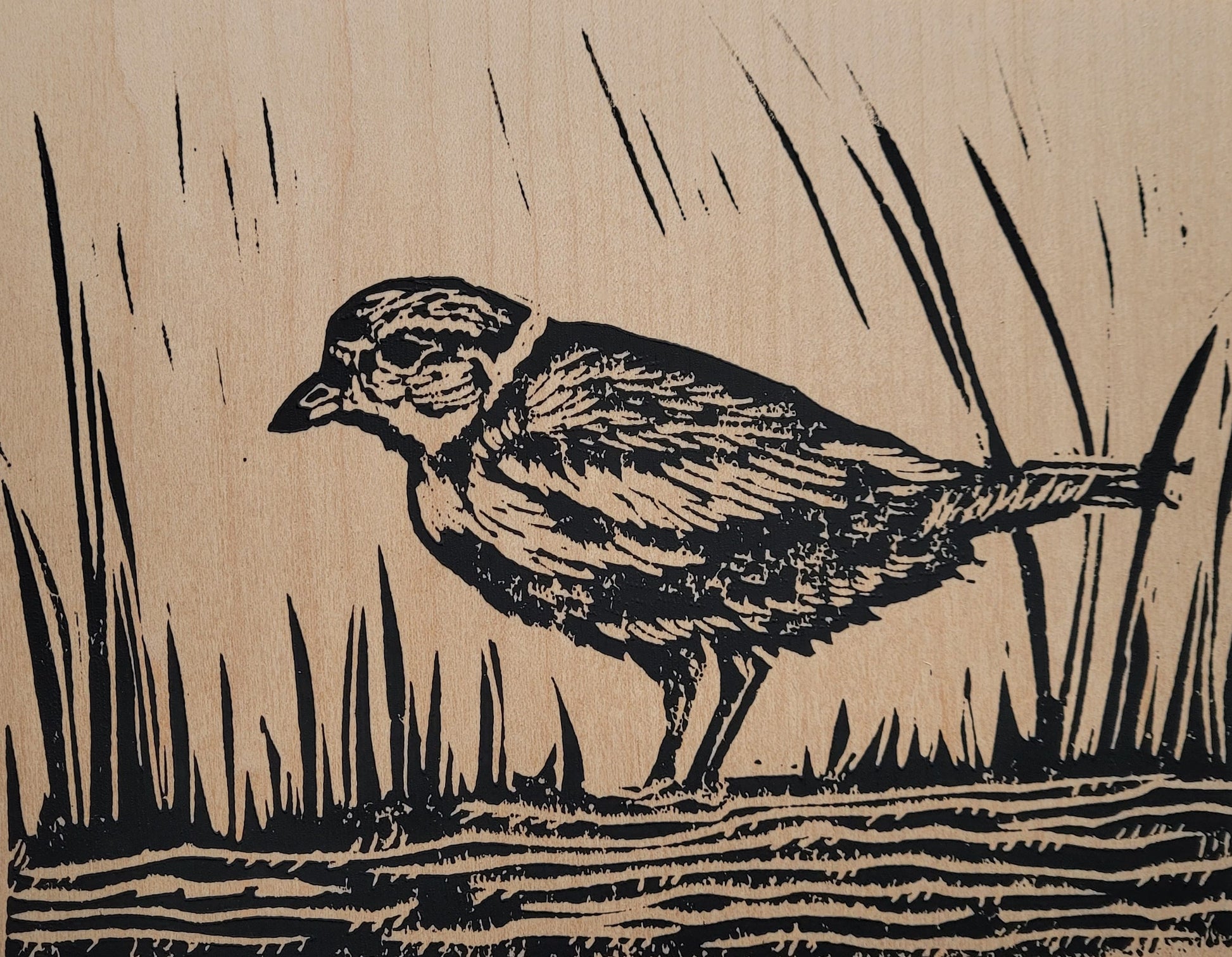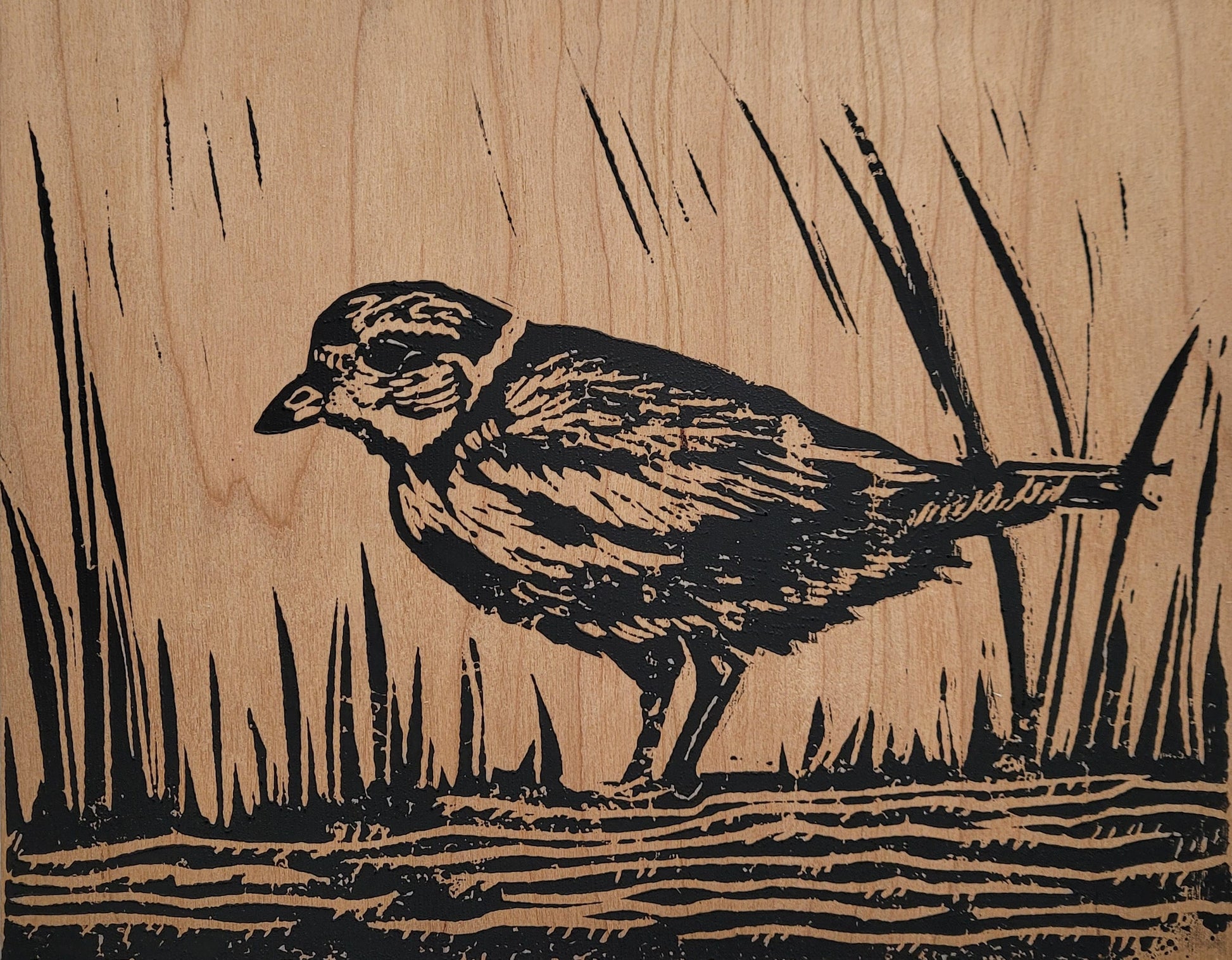Handpressed linocut printed with black ink on real Canadian wood veneer. Mounted on an 8 x 10 inch white backer making it easy to display in a standard size matte or frame.