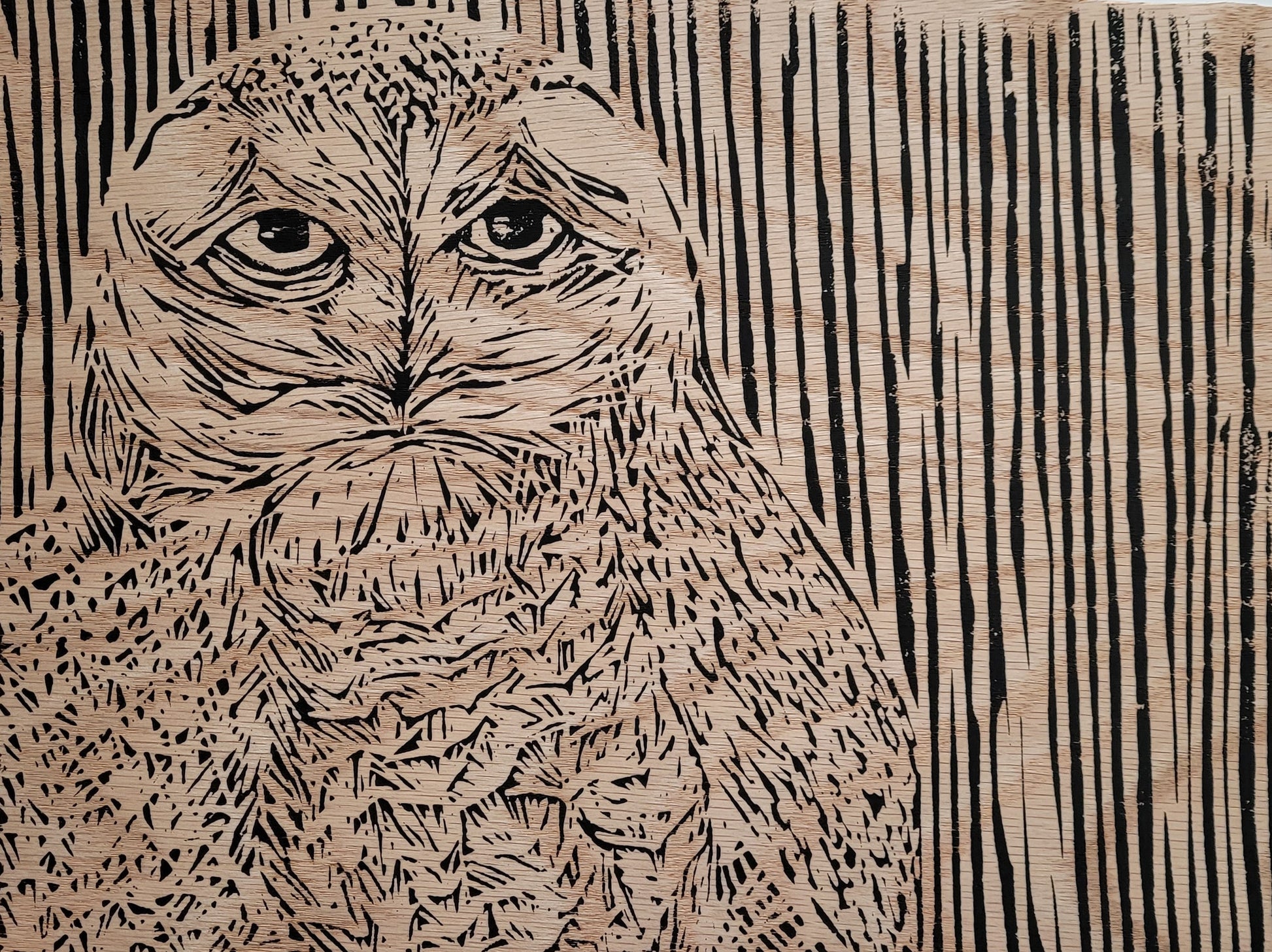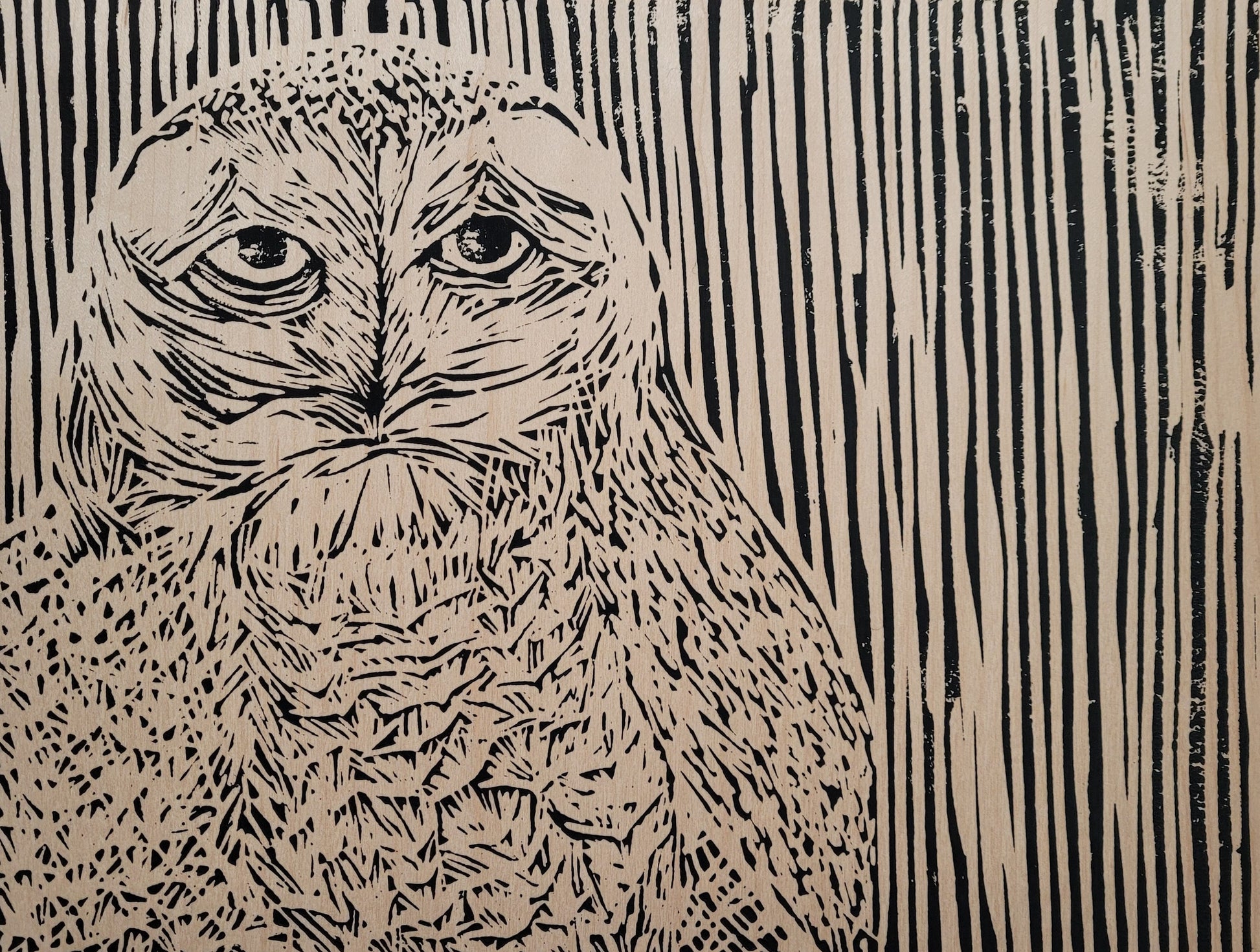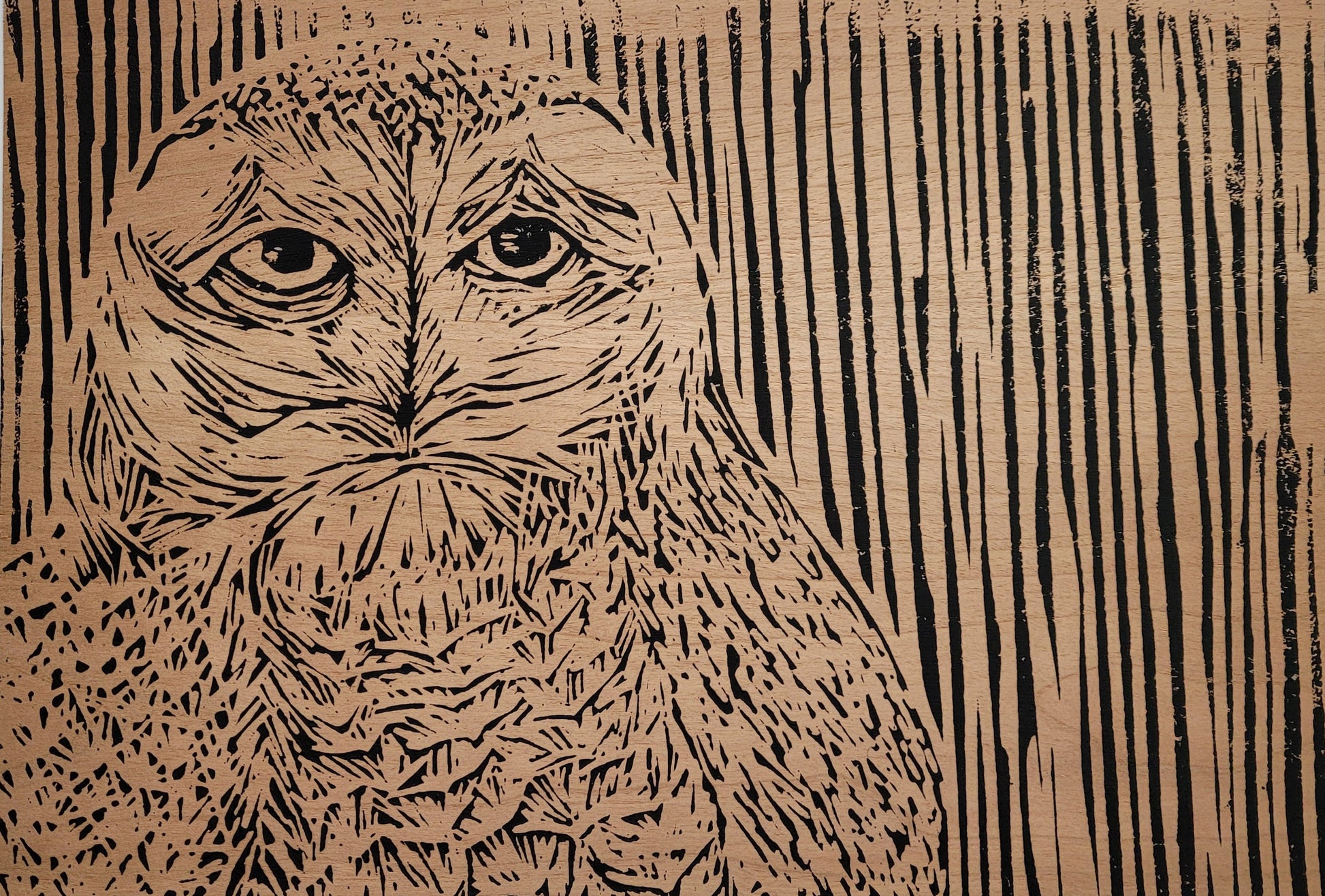 Handpressed linocut printed with black ink on real Canadian wood veneer. Mounted on an 11 x 14 inch white backer making it easy to display in a standard size matte or frame.