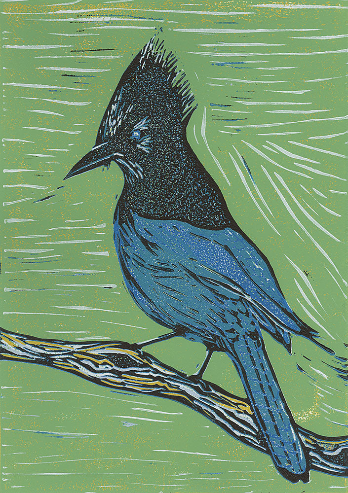 Our Provincial bird in British Columbia is this loud and proud Steller's Jay. Curious and friendly they are constant observers of us with a tilt of the head and flap of their wings. I wanted to capture the two tone blues in the feathers and display a strong black crown in this piece. The background represents a flush of spring green and fresh cool spring winds. Image size is 9x12 inches, series of 10, signed and numbered. Frame not included.