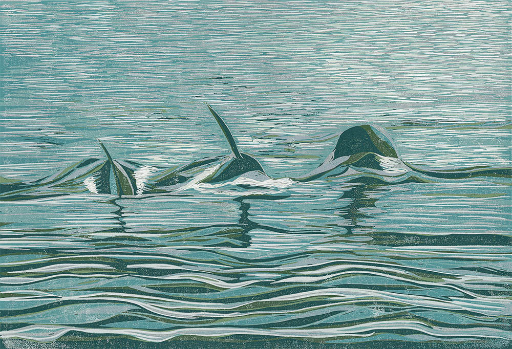 This piece was a collaboration from a client who has spent more than 10 years visiting north eastern Vancouver Island to observe a pod of orcas known as the A30s. I chose one of his photographs to represent three generations of females. I wanted the water to be the focal point creating a subtle but marked transition from the calm background of the ocean to the surprise of the pod surfacing towards the boat. Image size is 18x26 inches, series of 10, signed and numbered. Frame not included.
