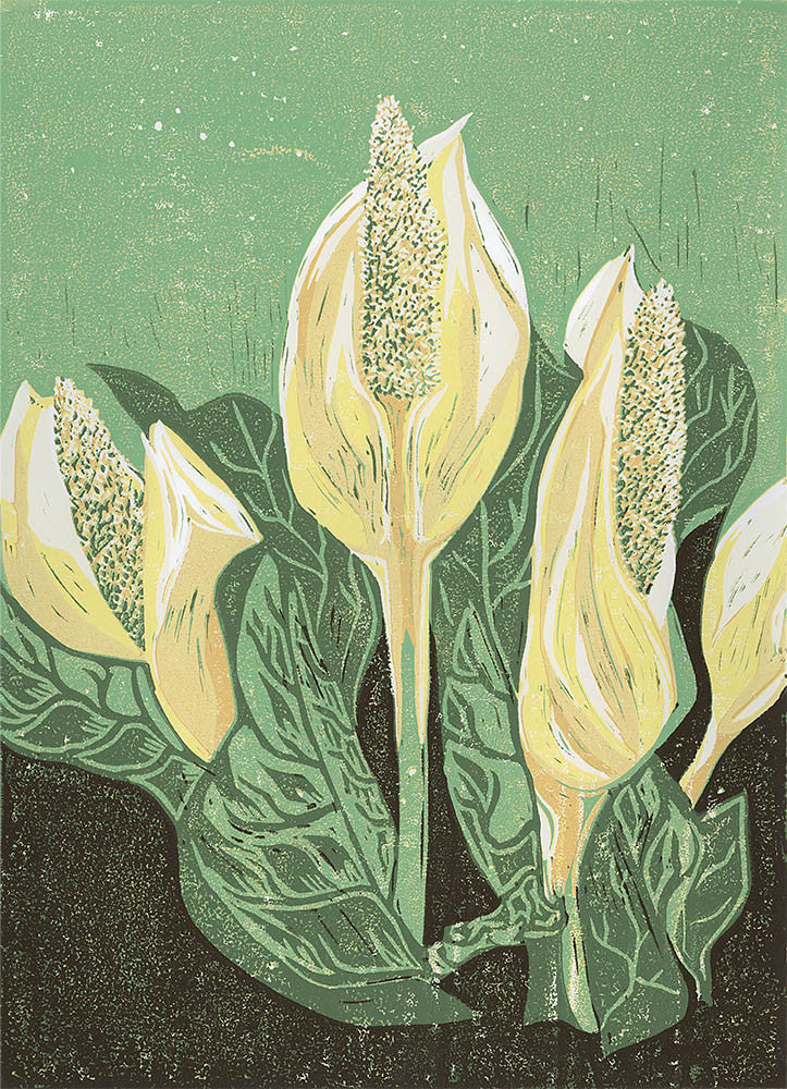 Swamp lantern or also known as Skunk Cabbage gives you two clues. In spring is rises out the deep dark black muck of the rainforest and has a distinctive odor too. This plant is known as a thermo-regulator taking its cue from increasing daylight and creating it's own heat to start growth. A big sunny yellow jungle plant in our temperate rainforest. Image size is 13x18 inches, series of 10, signed and numbered. Frame not included.