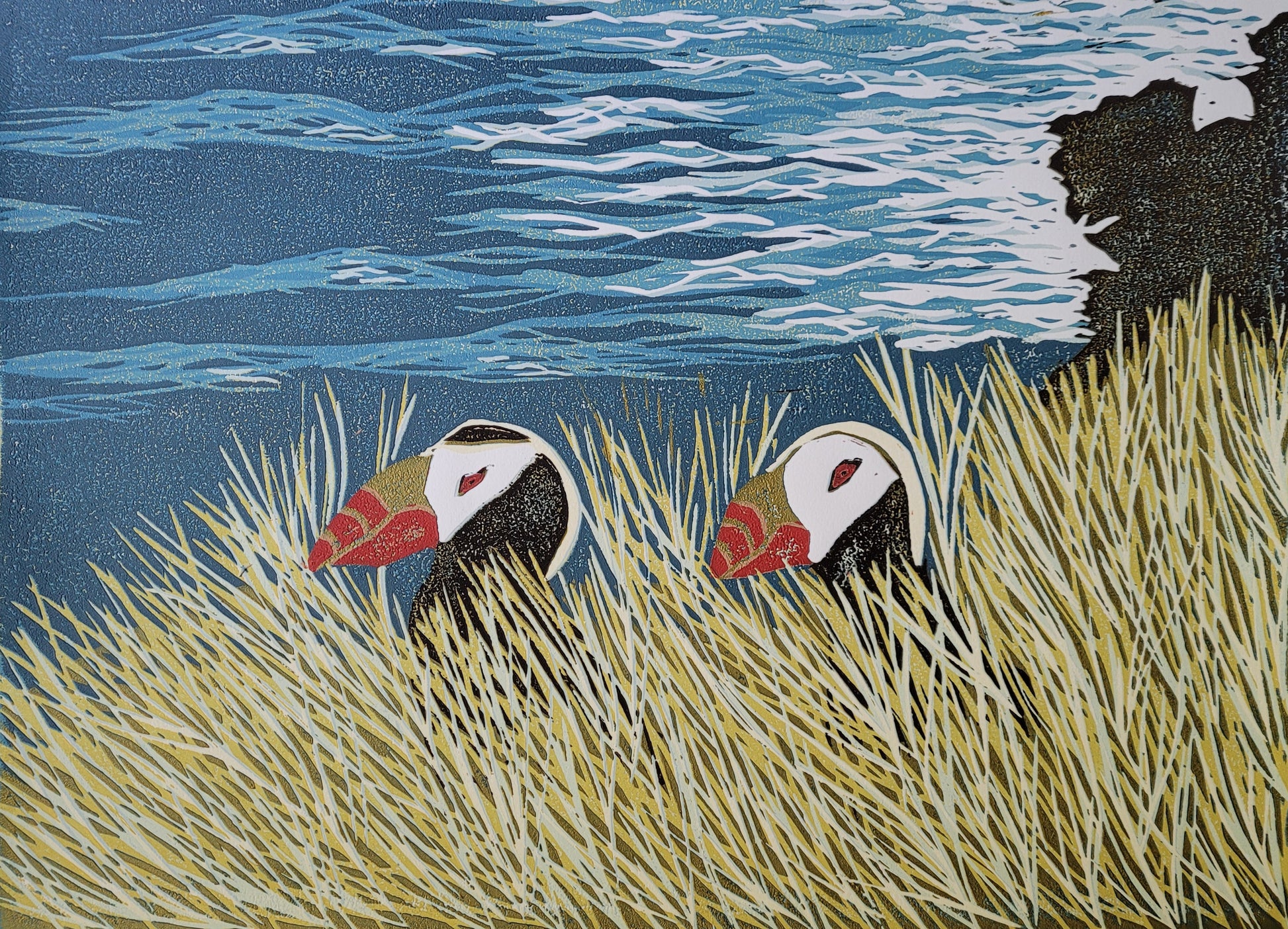 These are actually West Coast Puffins found on Triangle Island off of Cape Scott in the north end of Vancouver Island. Wild rocky and undisturbed by humans. Puffins nest high on the rocks in the grass with a crashing view of the Pacific below.