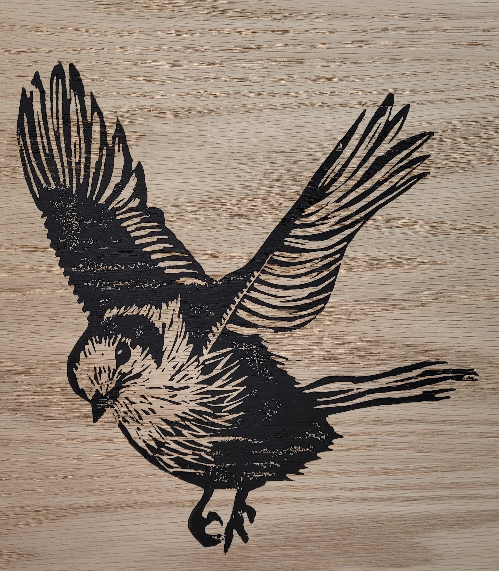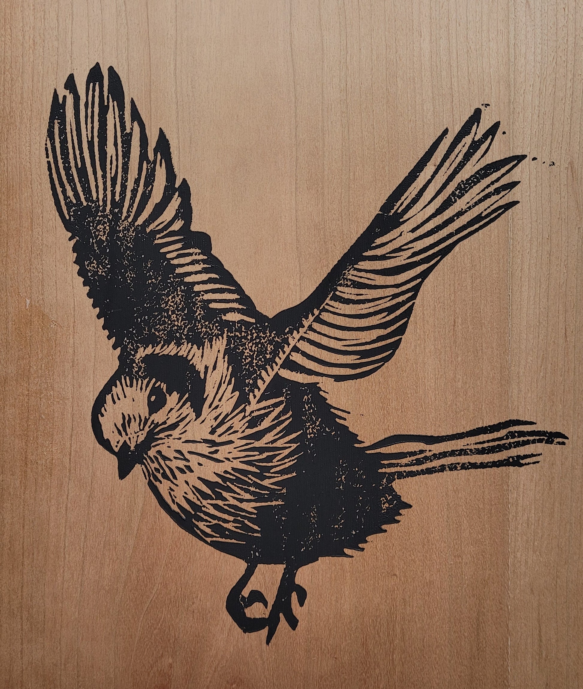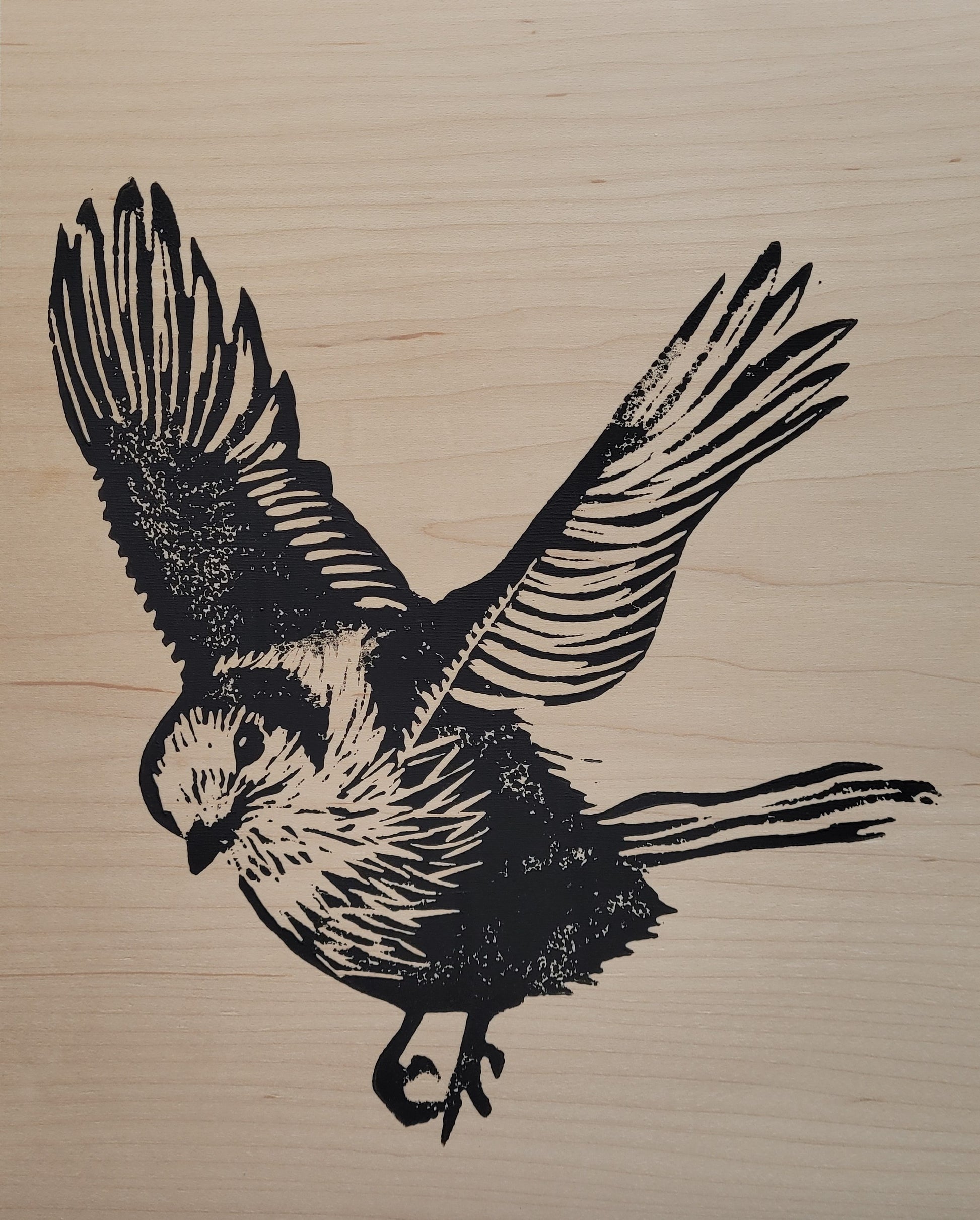 Handpressed linocut printed with black ink on real Canadian wood veneer. Mounted on an 11 x 14 inch white backer making it easy to display in a standard size matte or frame.
